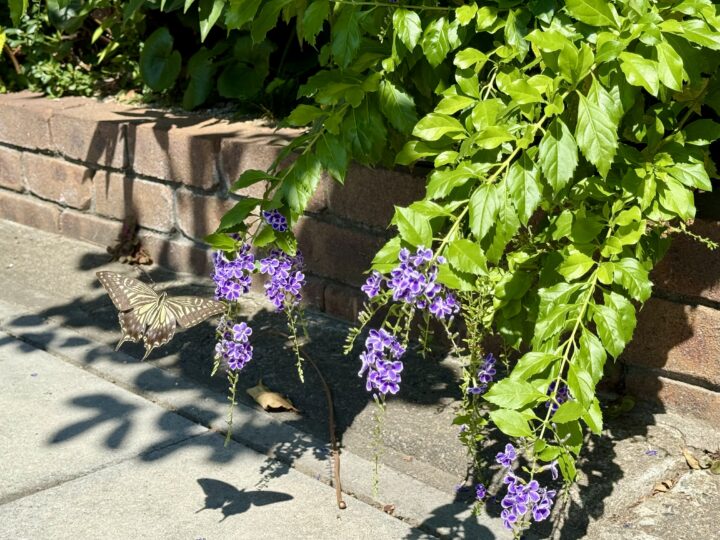 デュランタにアゲハ蝶 投稿者: chie | 2025年9月26日 0件のコメント 真夏の花壇はデュランタが花盛り 昔、小さな鉢で買ったのがこんなに大きく育ちすぎ! アゲハ蝶がひらひらと遊んでいるのを見つけ、急いでスマホ取りに家に入った まだ遊んでいてくれたので、1枚パチリ 蝶々のひらひら感は動画でないと臨場感に欠けるが ま、いっか 蝶々さん、わが家の花壇に来てくれてありがとうね。